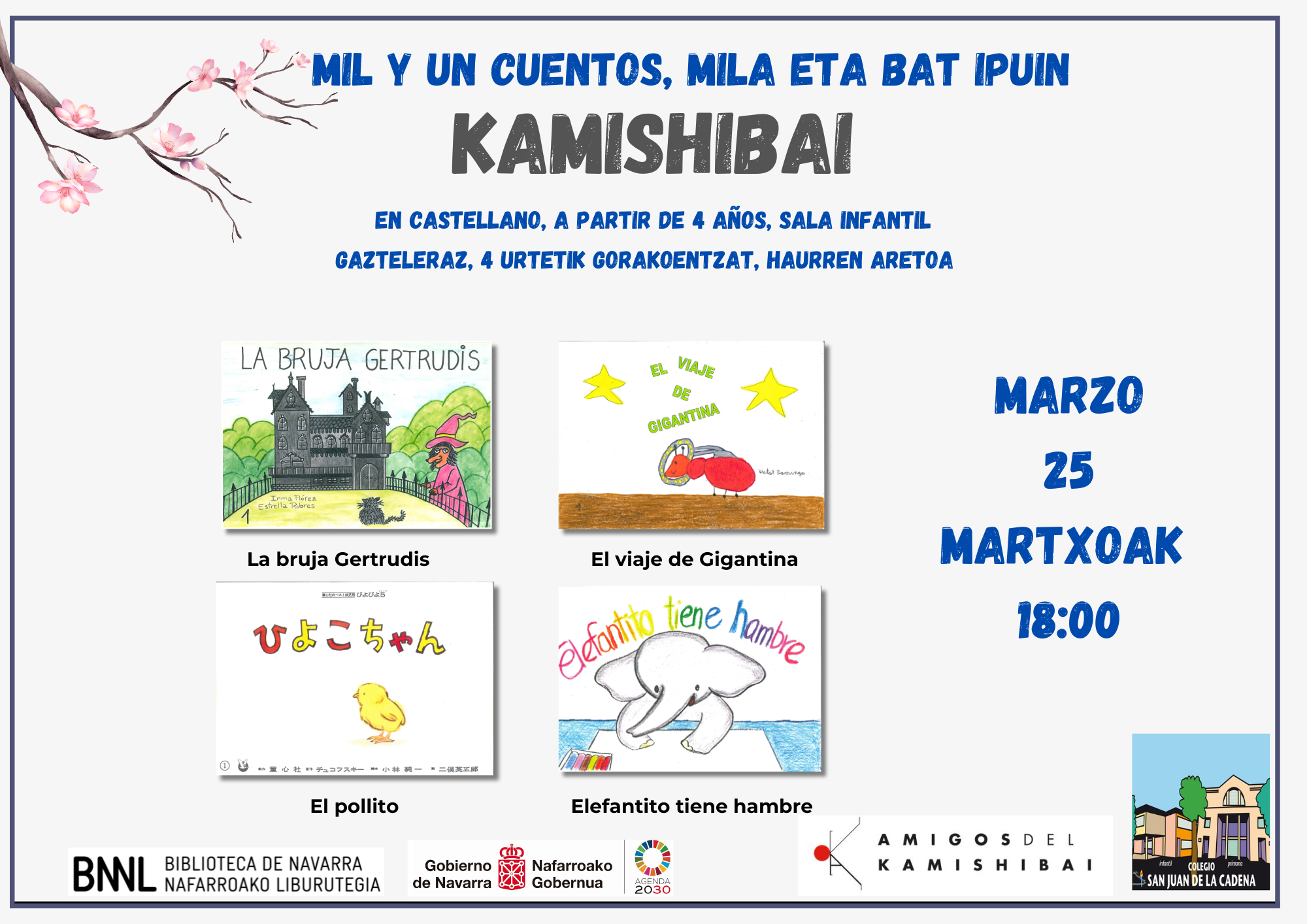 Os hacemos llegar el cartel de la interpretación de kamishibais que llevarán a cabo, este mes, los participantes del Taller de Kamishibai de 5º en la Biblioteca de Navarra.